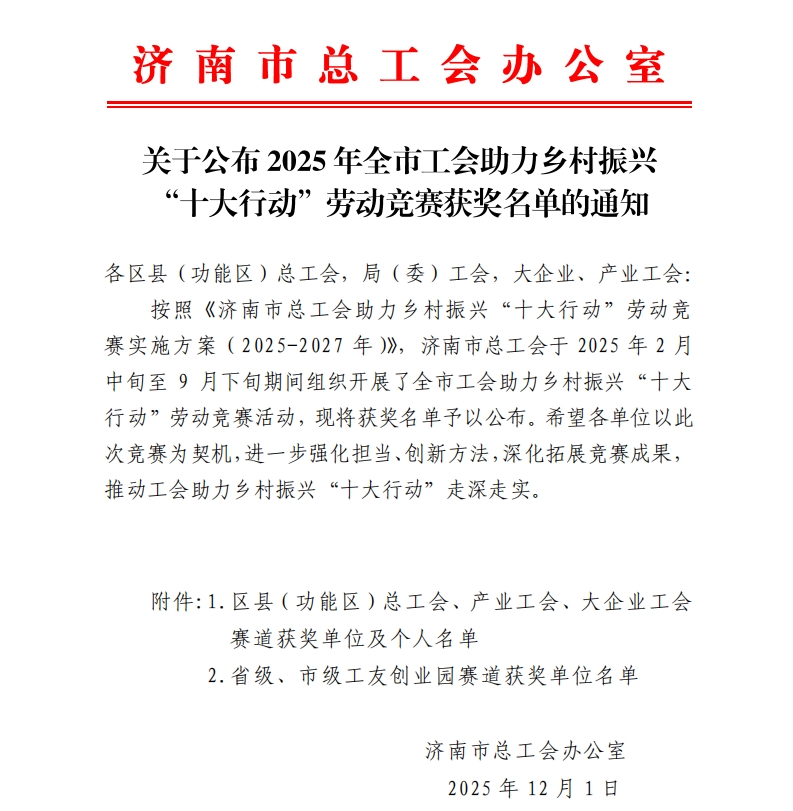 近日,2025年全市工會(huì)助力鄉(xiāng)村振興“十大行動(dòng)”勞動(dòng)競(jìng)賽獲獎(jiǎng)名單正式公布,濟(jì)南長(zhǎng)田實(shí)業(yè)有限公司成功斬獲省級(jí)、市級(jí)工友創(chuàng)業(yè)園賽道一等獎(jiǎng)。
